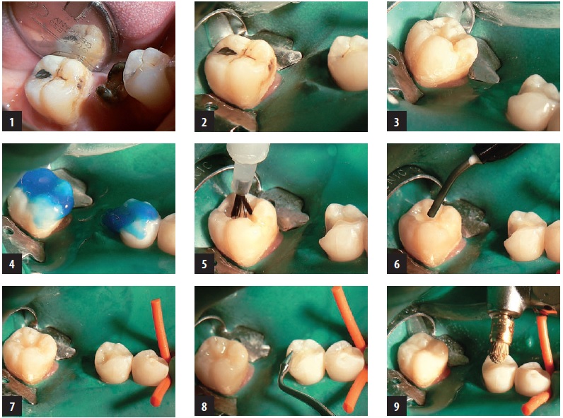 и неудовлетворенность эстетикой пломбировочного материала на зубе 47. Корню зуба 46 предстояла экстракция. Хирург-имплантолог принял решение о постановке в эту позицию имплантата. В зубе 45 необходимо было произвести лечение кариеса, а в зубе 47 — заменить пигментированный пломбировочный материал (рис. 1). Все работы в полости рта проводились с использованием изоляционной системы «Коффердам», которая позволяет в идеально сухих условиях добиться превосходных результатов (рис. 2).