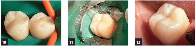 7-й этап. При полировке поверхности для сглаживания границ перехода использованы отделочные карбиды, резинки с пастами (рис. 9). Окончательный вид реставрации приведен на рис. 10—12.