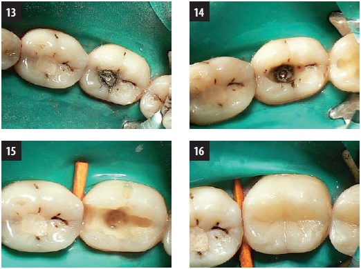 На рис. 13—16 продемонстрирован еще один клинический случай. В зубе 37 под амальгамой был диагностирован кариес. Кариозные изменения имелись и на медиальном контакте.