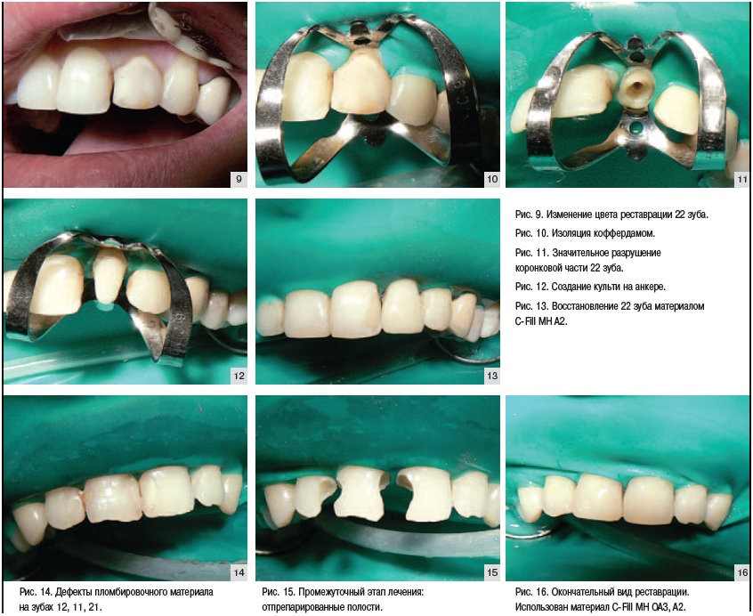 В связи с множественными дефектами пломбировочного материала было принято решение заменить старую реставрацию. В процессе лечения проводилась работа в канале. Поcле удаления всех некротизированных твердых тканей, мы получили полное отсутствие коронковой части зуба. Для поддержки конструкции был установлен анкер. Восстановление производилось в несколько этапов. Изначально на анкер была сформирована культя из опакового материала. Далее формируем основной дентинный слой. Заключительным этап – нанесение эмали C-Fill MH A2. Отсутствие выраженной прозрачности режущего края на соседних зубах исключило применение транспаранта.