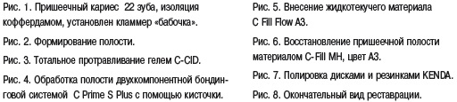 Пациент обратился в клинику с жалобами на реакцию зуба на термические раздражители и появившуюся полость. В результате обследования в пришеечной области зуба 22 определяется дефект твердых тканей V класса по Блэку. Все работы в полости рта ведутся с применением изоляционной системы коффердам. Для ретракции десневого края был установлен дополнительный кламмер «бабочка». Для точного подбора цвета осуществляется очистка зуба пастой и щеткой. Производится минимальная инвазивная обработка. При использовании материала C-Fill MH используется техника тотального протравливания. Далее следует нанесение двухкомпонентной бондинговой системы C-Prime S Plus на основе этанола.