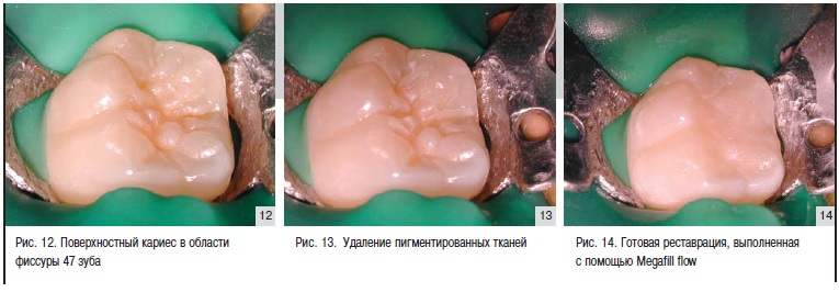 шприц под давлением, поэтому наличие пор в тюбике неизбежно. Поэтому лучше материал нанести сначала на инструмент, используемый при адаптации, а затем непосредственно в полость. После окончательной полимеризации в течение 20 секунд светодиодной лампой Megalux (Megadenta), мы еще раз совершаем визуальный контроль за наличием пор. Финишная полировка производится “резинками” или дисками. Конечный результат – это отсутствие пораженных тканей и отличный эстетический эффект. На рисунках 12-14 приведен еще один пример герметизации фиссур с раскрытием твердых тканей. У пациентки 17 лет диагностирован фиссурный кариеc 47 зуба. Были проведены работы, аналогичные первому клиническому случаю с
