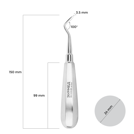 Для удаления корней и зубов на нижней челюсти применяется элеватор конструкции Флор от ЭУР-МЕД Денталдепо. Щечка изогнутого инструмента имеет форму желоба с закругленным концом и шириной рабочей части 3.5 мм.Удаление корней и зубов в ротовой полости данным элеватором осуществляется по принципу рычага. Ручка инструмента восьмигранная, благодаря чему элеватор надежно фиксируется и не скользит в руке.