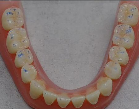 Врач может сразу распознать, какая сторона больше подвергается жевательной нагрузке. Особенно при проверке окклюзии тотальных протезов, которая проводится, главным образом, по методу билатеральной сбалансированной окклюзии, желательно равномерное отображение всех контактов.
